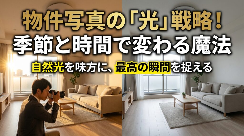 顧客は、物件写真の量と質で不動産会社をふるいにかけている。立地でも、価格でも、店舗のアクセスでもなく、まず写真。この現実に対して、「とりあえず撮ればいい」では勝てない。本稿では、四季の光の変化と時間帯ごとの特性を活かした物件写真の撮影戦略を、現場で即実践できるレベルまで掘り下げる。