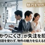 2026年2月14日 / 最終更新日 : 2026年2月6日 housecomfc 05. 経営全般 「伝わらない説明」が契約を逃す? 専門用語ゼロで物件の魅力を120%届ける接客テクニック 不動産賃貸仲介の現場で、こんな経験はないだろうか。物件の魅力を一生懸命に伝えたのに、お客様の表情がどこか曇っている。「徒歩○分、RC造、1LDK、南向き、築浅」——正確な情報を並べたはずなのに、なぜか響かない。実は、その […]